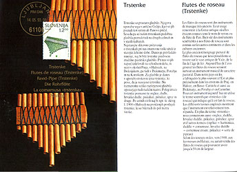 Posebno lepo so bile pripravljene zloženke za nadaljevanko Slovenija – Evropa v malem. Na sliki je leva stran sprednja, slikovno bogata, desna stran pa kaže eno izmed tekstovnih strani, ta je v slovenščini in francoščini, katerih je bilo pri vsaki znamki nekoliko drugačno število, vendar največ deset. Tudi znotraj tekstov so se občasno pojavile slike. V vsaki od teh zloženk je bil enak tekst pod naslovom Slovenija – Evropa v malem, ter tekst , ki je opisal prikazani predmet. V tem primeru so to Trstenke. Oba teksta sta v tem primeru natisnjena v šestih jezikih. Velikost zložene zloženke je 11 x 16 cm.