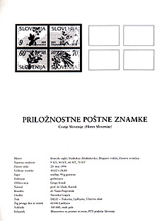 Primerek takratne oblike in vsebine vložnega lista, ki pa je bil bistveno bogatejši s tekstualnim delom, saj je na zapognjeni strani opis vsebine znamk v več jezikih, kar na običajnih vložnih listih ni pogosto. Slabost je bila predvsem v črno-beli tehniki, ki za konec prejšnjega stoletja ni bila ravno »in«. Tudi papir je bil premehak in prostor za lepljenje hawida, v katerega bi se vstavljalo znamke ni bil posrečeno izbran. Velikost A4 formata pa je bila prilagojena navadnim pisarniškim mapam, kar je potrošnike tudi odvračalo. Spomnimo se na luksuzne mape nekaterih tujih dobaviteljev. |