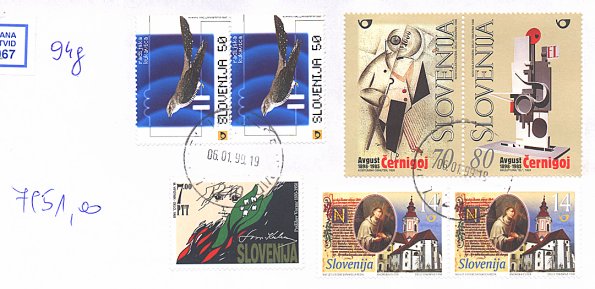 Druga ovojnica, na katero bi rad opozoril, je iz pisarne direktorja sektorja znane tovarne zdravil v Nemčiji. Nima povezave s kakšnimi zbirateljskimi ambicijami, je le produkt miselnosti, da morajo vsa pisma, ki jih podpisuje on sam, lepa na pot. Ovojnica je bila zato v pisarni sektorja opremljena z lepim četverčkom (štiri znamke v kvadratu). Ovojnica seveda ne gre v strojno žigosanje, temveč tajnica poskrbi, da se na poštnem okencu žigosa z ročnim poštnim žigom. Ker je frankaturna vrednost četverčka premajhna, poskrbi poštni uslužbenec za dodatne, tokrat frankovne znamke, ki jim lepo razporedi. Poštni uslužbenec tudi ve, kaj mora s takim pismom delati. Pritisniti mora lepo očiščen ročni žig v sredino četverčka (glej tudi prejšnji primer), ne premočno, da se znamke ne poškodujejo. Na sosednjih manj pomembnih znamkah tudi žig ni tako pomemben, ne sme pa segati na že žigosani četverček. Na vseh poštah po Evropi si lahko zaželite okrogli ročni žig in ustreženo vam bo po vseh pravilih. Celo izbirate lahko, preko katerega kota znamke naj seže žig ali pa naj bo na znamki v celoti, da bodo berljivi vsi podatki. Pogosto se ob posebni prošnji celo primeri, da vam potisnejo žig v roke in ustrežljivo asistirajo pri vašem pedantnem žigosanju. Resnici na ljubo moramo povedati, da ročni žig dobite tudi pri nas, če zanj zaprosite, razlika je le v tem, da ga večinoma pribijejo na približno merjeno mesto in ne le pritisnejo. V slikovnem delu je priloženo še nekaj primerkov dospelih ovojnic, med katerimi boste prepoznali tudi takšne, ki jih vaši korespondenci namenjajo vam. Za slikovni prikaz povratne pošte ni smiselno trošiti papirja, saj naše valovite črte, strojne žige, razne nalepnice iz avtomatov poznamo ali pa si jih lahko tudi mimogrede ogledamo, saj so vedno pri roki.. V Združenih državah Amerike se tako kot pri nas z lepotno opremo ovojnic ne ukvarjajo posebno pogosto; sicer si pa primerov z druge strani zemeljske oble ni treba jemati za vzor. V tem posplošenem pisanju smo bili nepošteni do mnogih, ki s kulturo v srcu želijo narediti nekaj več, pa ne morejo, zato se jim opravičujemo. Pošta namreč potuje po naprej določeni poti, v kateri nastopajo različni ljudje in tehnični pripomočki in vsak med njimi vpliva na končni izdelek, ki ga naslovnik prejme. Če torej tajnica želi izboljšati izgled ovojnice, pa nima znamk; če kurir odnese ovojnice na ročno žigosanje, pa ne najde prijazne uslužbenke, ki bi to znala in tudi hotela; če uslužbenka na pošti želi lepo žigosati, pa ni primerno opremljenih pisem, ker tajnica ne more dobiti priložnostnih znamk… Če torej celo temo ponovimo bo rezultat isti? Mi pa pišemo zato, da ne bi več ponavljali, a žal moramo! Ko smo v Lukasu 2/92 pisali Slovenskim znamkam na pot, smo primerjali slovensko naklado za zimske olimpijske igre z naklado enakih znamk manjših evropskih držav in ugotovili, da je naša naklada tudi do dvajsetkrat nižja. Letos, ko je izdaja za zimske olimpijske igre zopet tu, so nas nagradili z izjemno visoko naklado 210.000 serij. V resnici to pomeni, da smo po številu serij še vedno nekajkrat prekratki, posebno še, ker hoče večina med zbiralci imeti v svoji zbirki malo polo, ki jo sestavljajo tri serije znamk skupaj. Pri tem nič ne pomaga izgovor, da smo še manjši od majhnih, da smo manj pismeni, da vse več uporabljamo fax in torej večje količine znamk ne potrebujemo. Končno bi lahko vsem tem izgovorom verjeli, če ne bi izdaja olimpijskih znamk pošla v nekaj dneh.