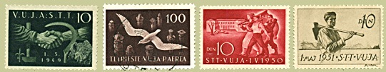 Leta 1948 se na znamkah za Cono B pojavi oznaka STT - Svobodni teritorij Trsta in VUJA - Vojna uprava jugoslovanske armije, ki se kasneje spremeni v VUJNA, ker je bil dodan vzdevek "narodna". V tem sklopu je veliko število znamk za zbirko Slovenika, saj so tako uporabljeni motivi s slovensko vsebino (pretiski jugoslovanskih znamk) kot tudi posebej za to področje izdelane znamke s slovensko udeležbo predvsem pri izdelavi osnutkov (M. Strenar, R. Krošelj, J. Trpin, B. Jakac) in tiska v tiskarni "Ljudska pravica" v Ljubljani.