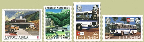 Pojavljajo se tudi znamke, ki opozarjajo na gospodarski napredek, kot je to v primeru skupne izdaje z Avstrijo ob otvoritvi Karavanškega predora ali na Gambijskih znamkah prikazani avtobusi MAN na razstavi CAPEX 97 v Torontu, ki so oblečeni v karoserijo Avtomontaže iz Ljubljane. V raznih kombinacijah s tekmovalci in panogami pa so se, med slovenskimi izdelki, še največkrat pojavile smuči ELAN (Paragvaj, Centralna Afrika itd.).